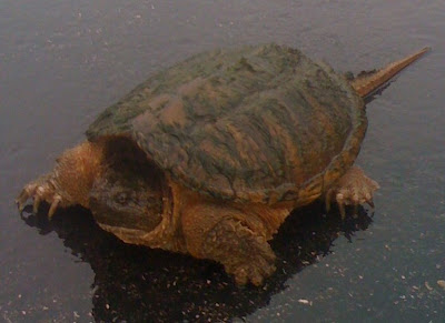 Snapping turtles can be both deceptive and dangerous. I certainly hope #1 son's little friend did not go out and say, "Oh, look! A turtle! How are you, little turtle? Let me pet your head for a minute." Because if he did, he will show up for school with a bloody stump where one hand used to be, and I might feel just a tad responsible.